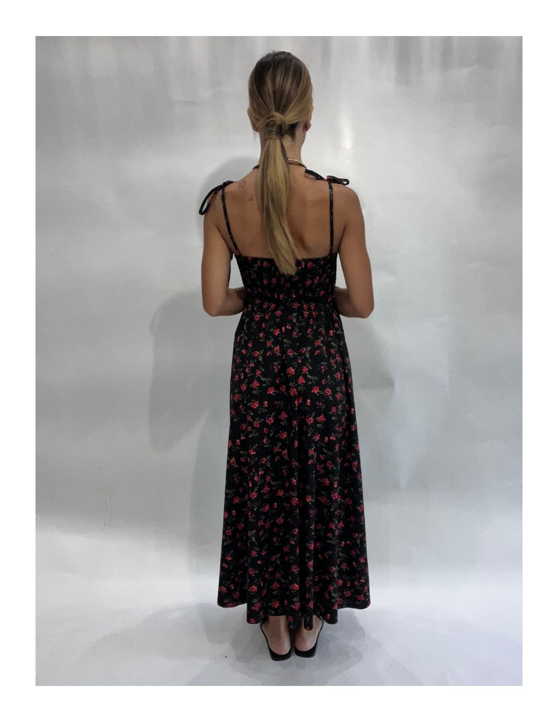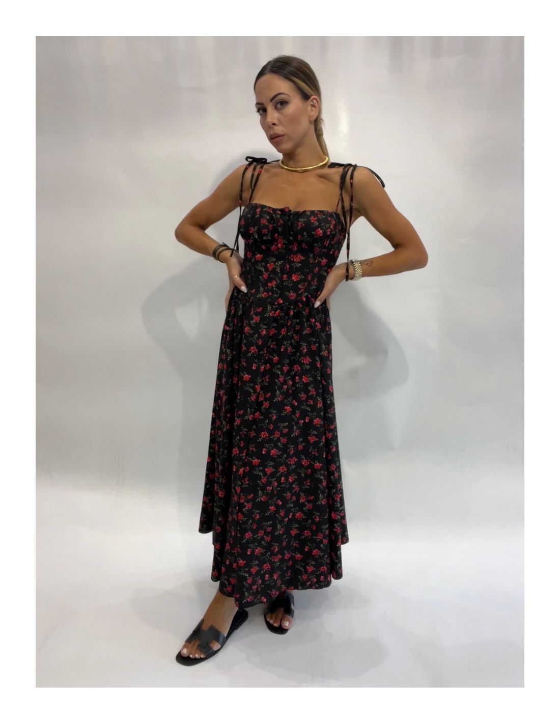 Abito satinato con fantasia a fiori rossi.