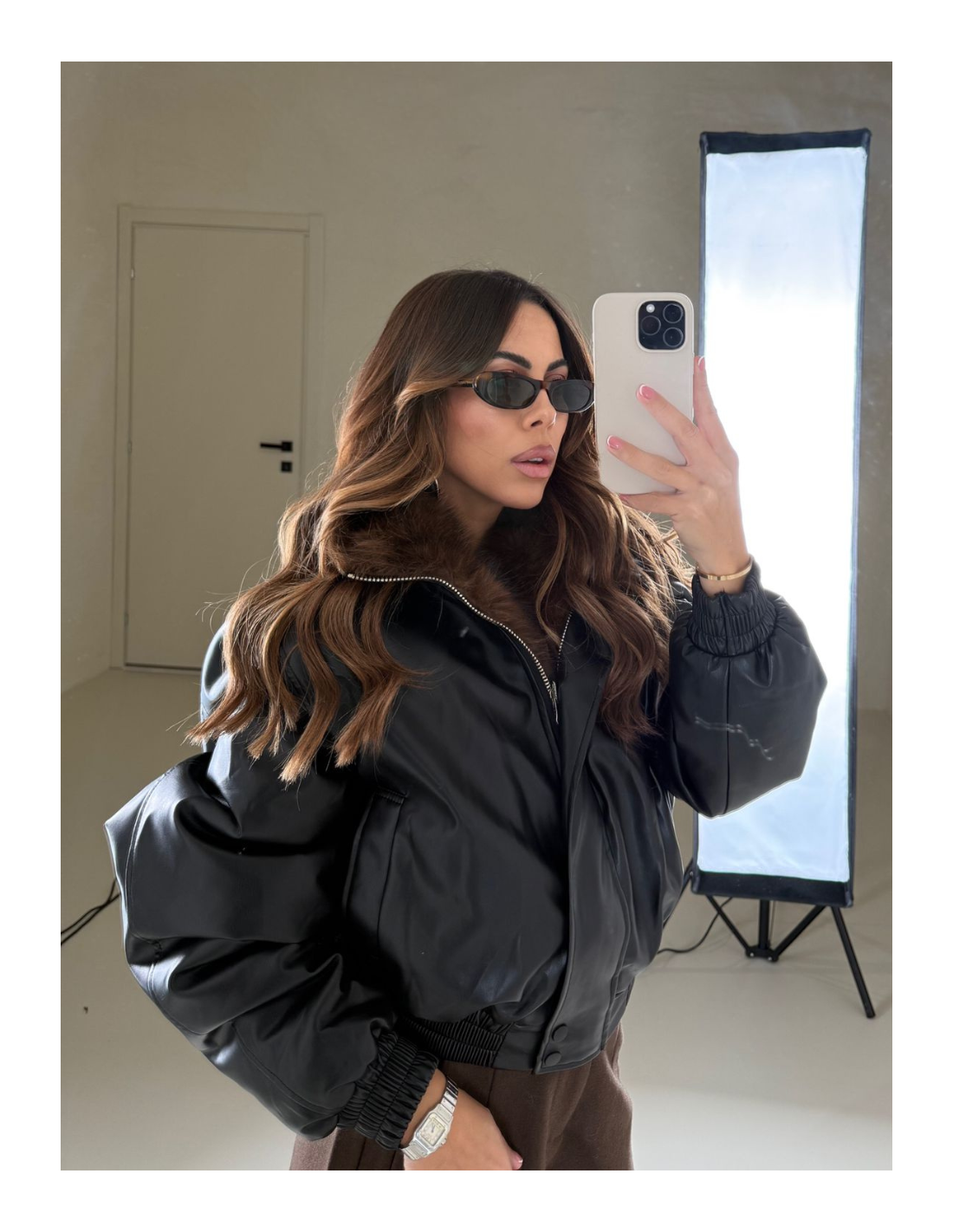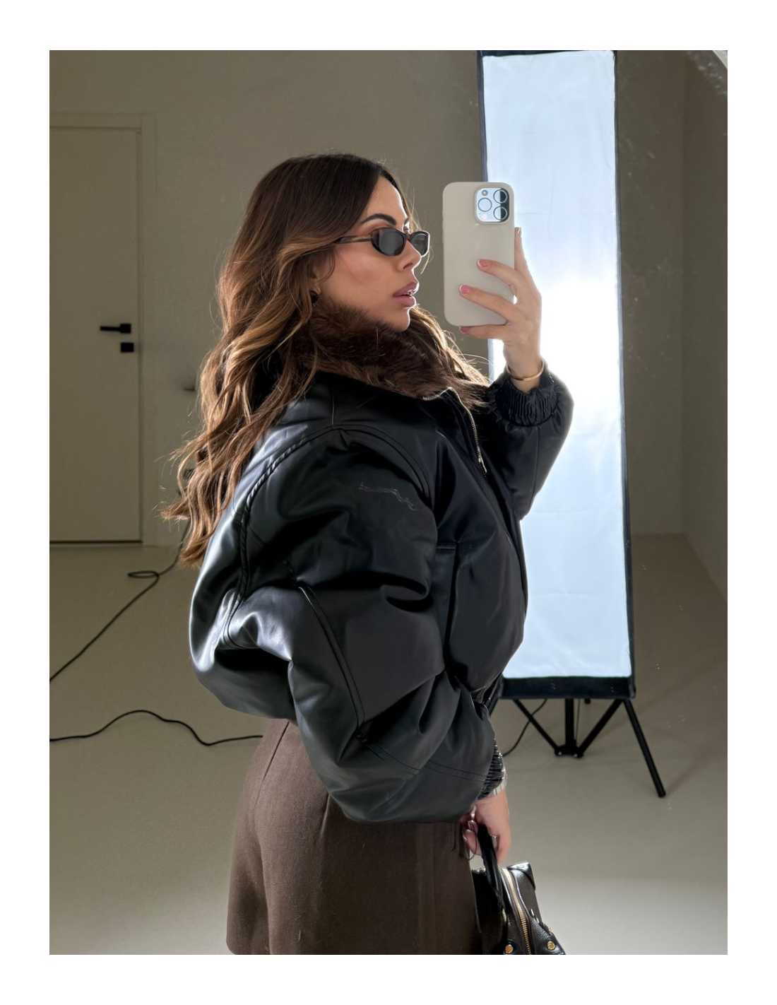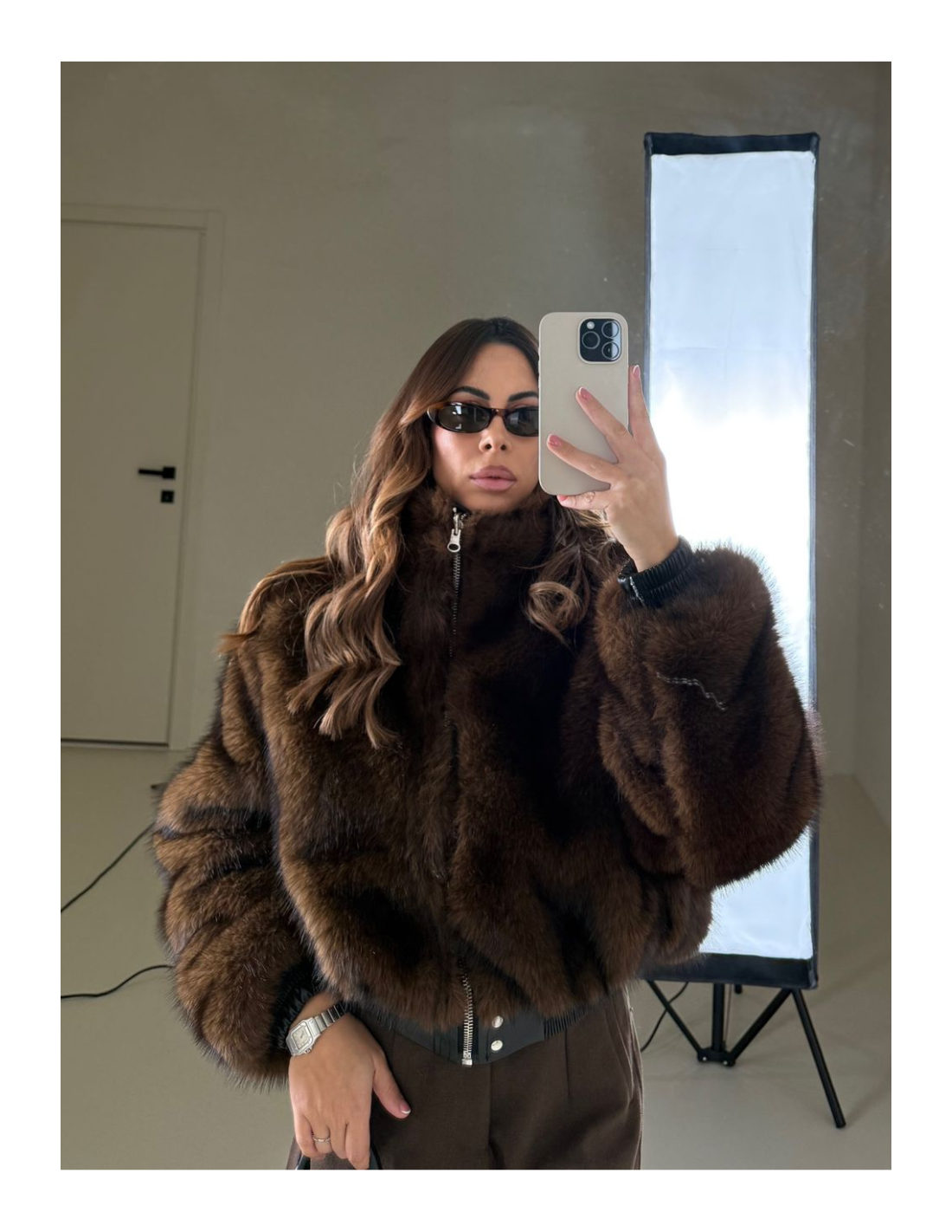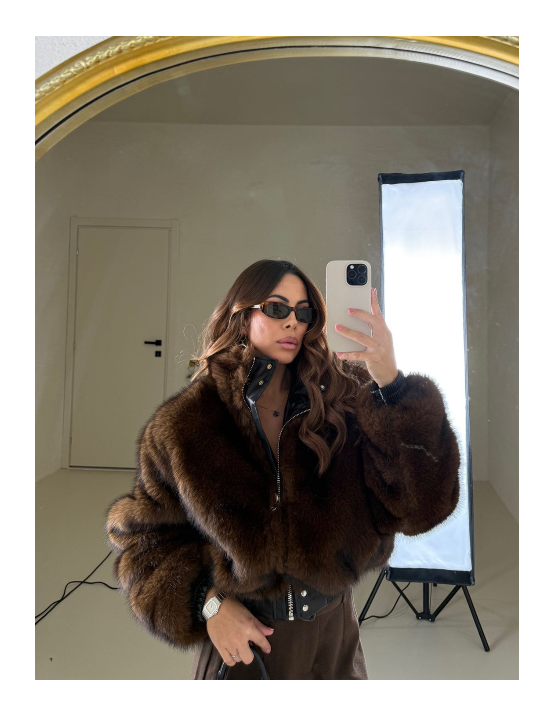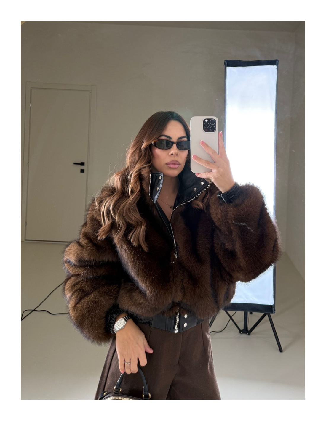 Dettaglio applicazione in pelliccia sintetica all’interno in contrasto .