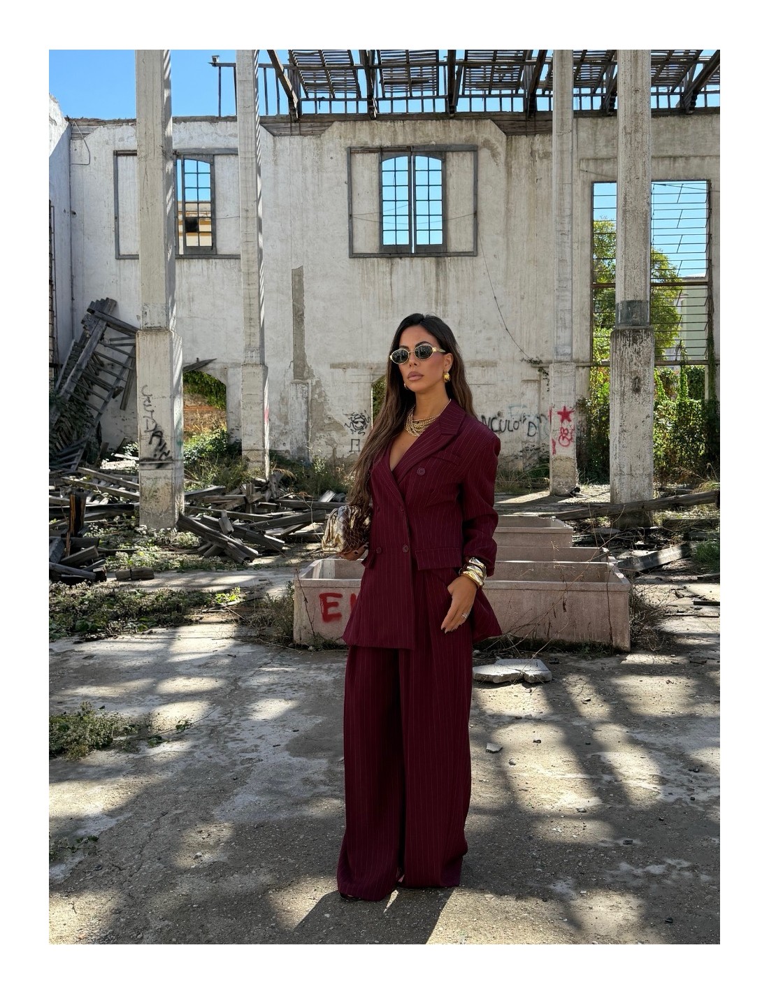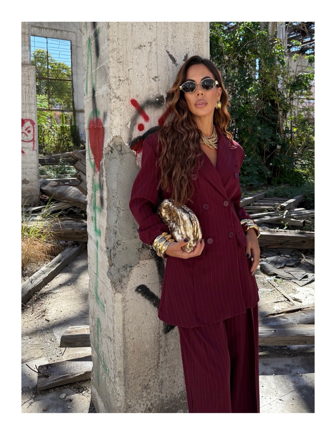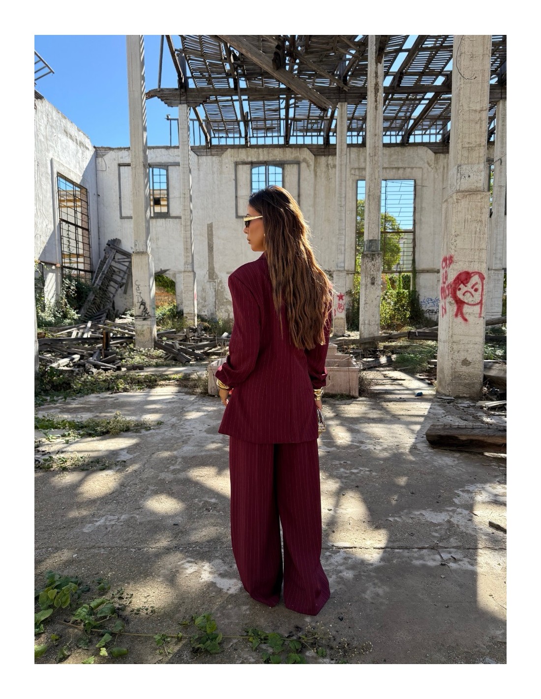 Tailleur gessato composto da  blazer doppiopetto e pantalone gamba dritta con elastico sul retro, zip e bottoncino.