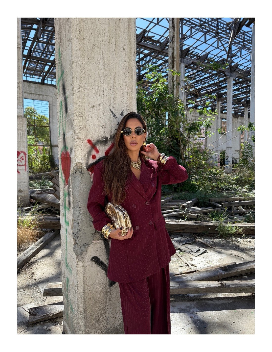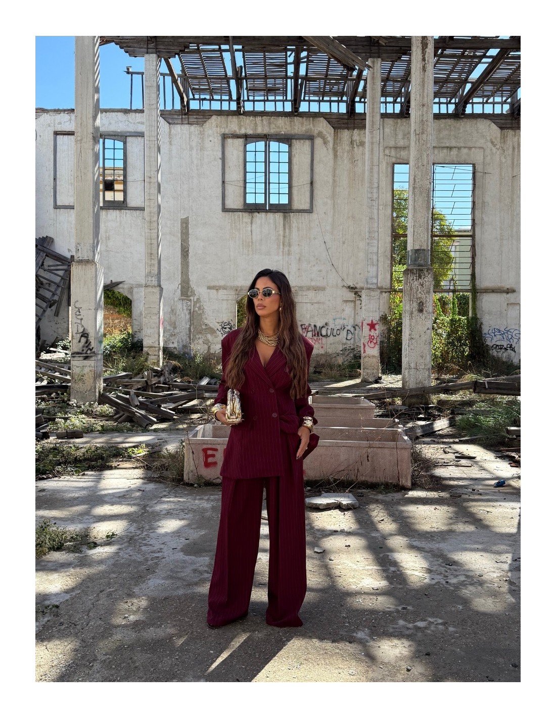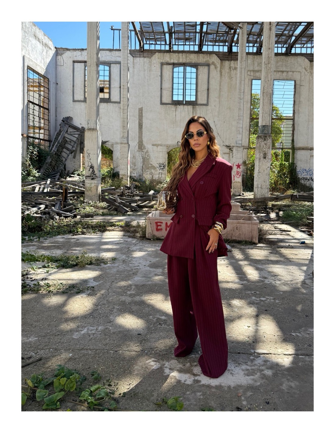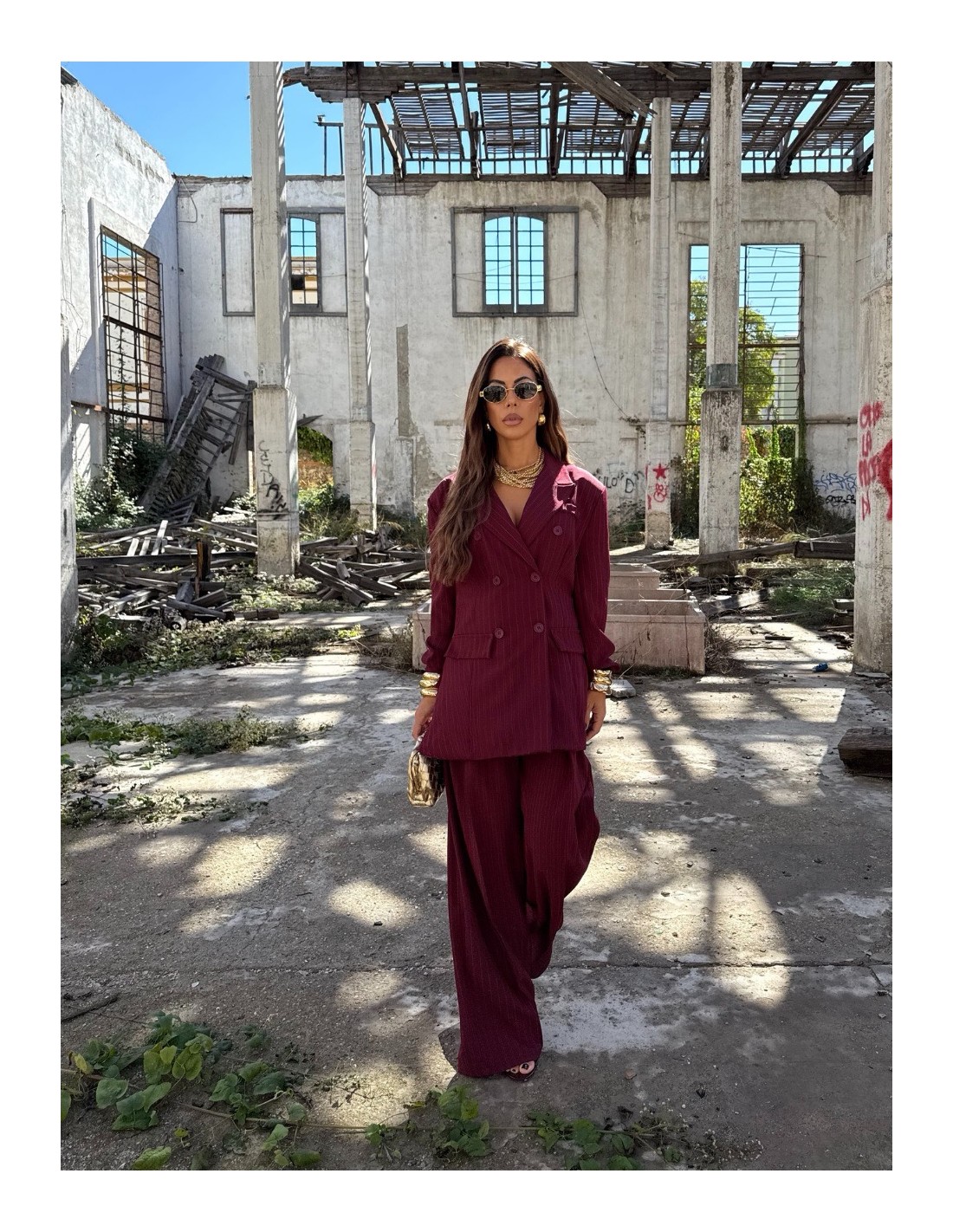 Tailleur gessato composto da  blazer doppiopetto e pantalone gamba dritta con elastico sul retro, zip e bottoncino.