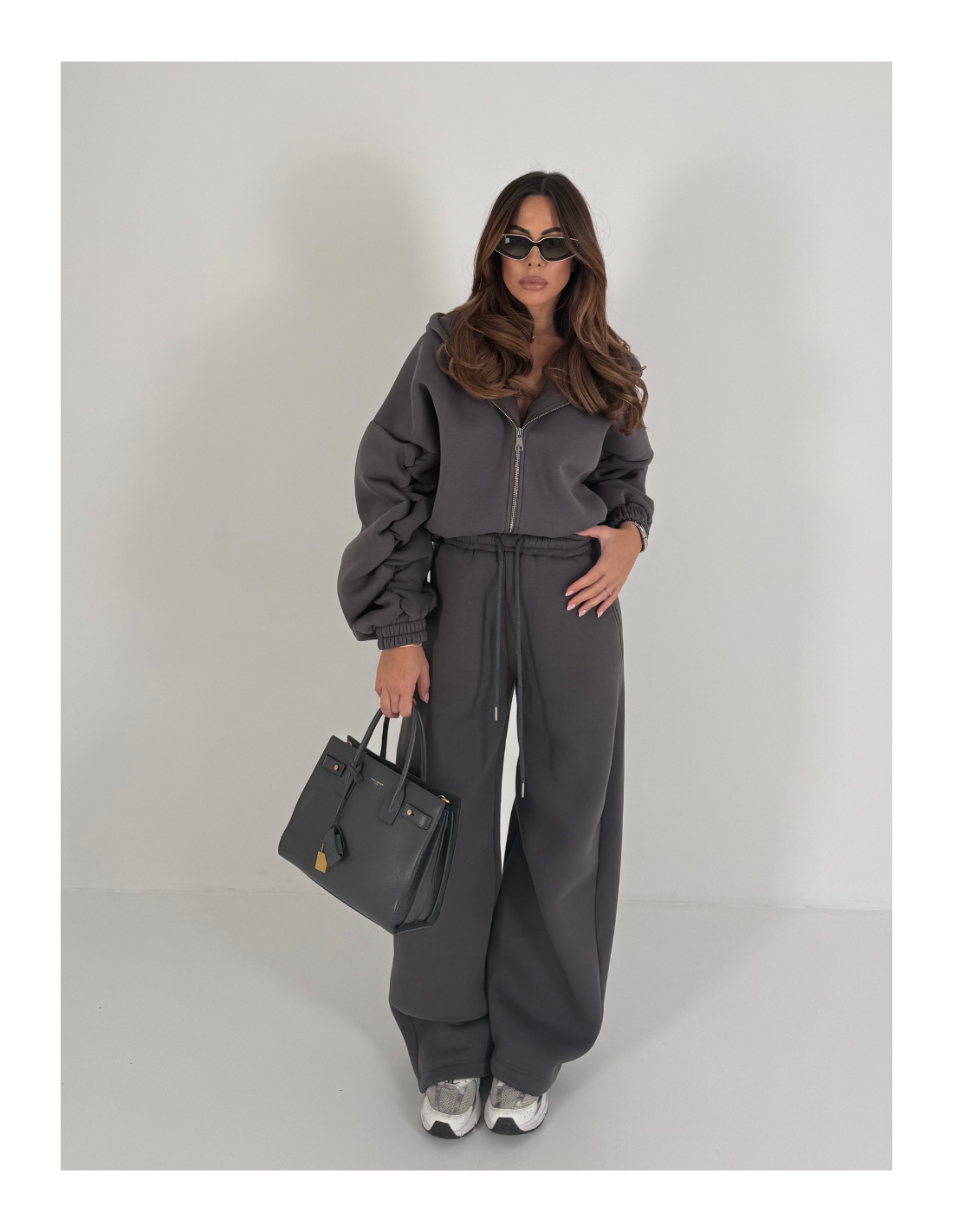 felpa con cerniera e cappuccio ,particolarità delle arricciature sulle maniche