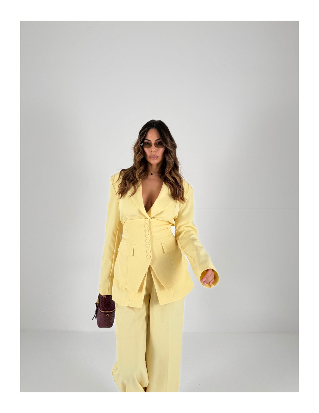 panciotto rimovibile e regolabile sul retro , con tasche finte sul davanti e bottoni rivestiti