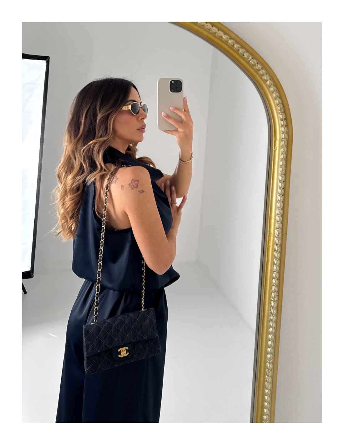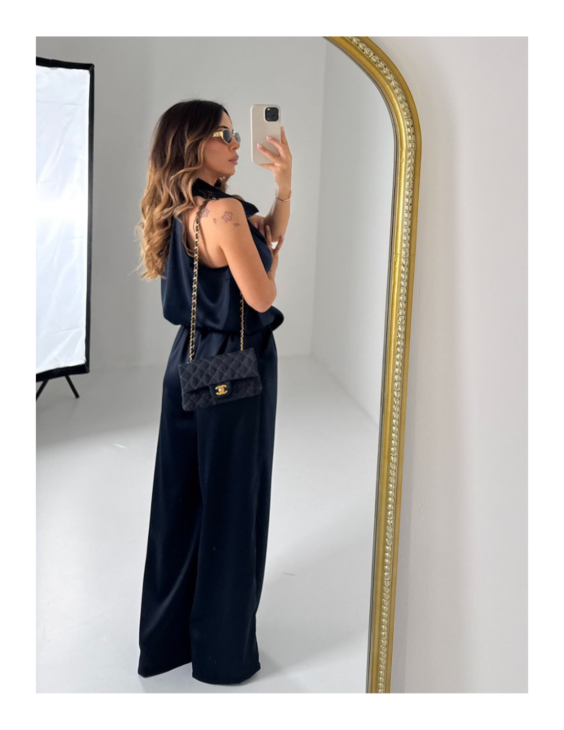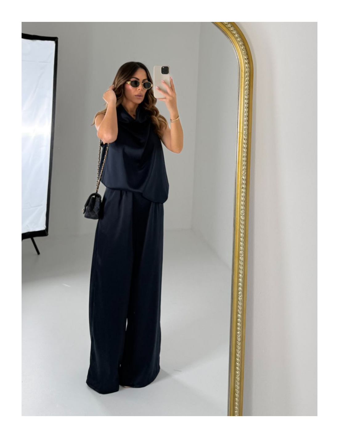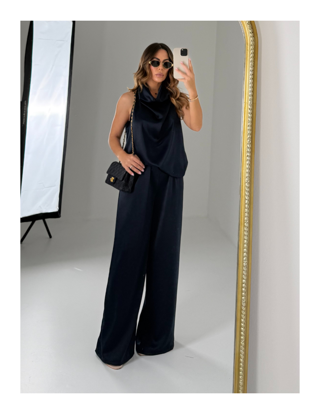 Il pantalone è coordinato nello stesso tessuto e colore, con una linea dritta e fluida, che scende morbida lungo la gamba allungando la figura.