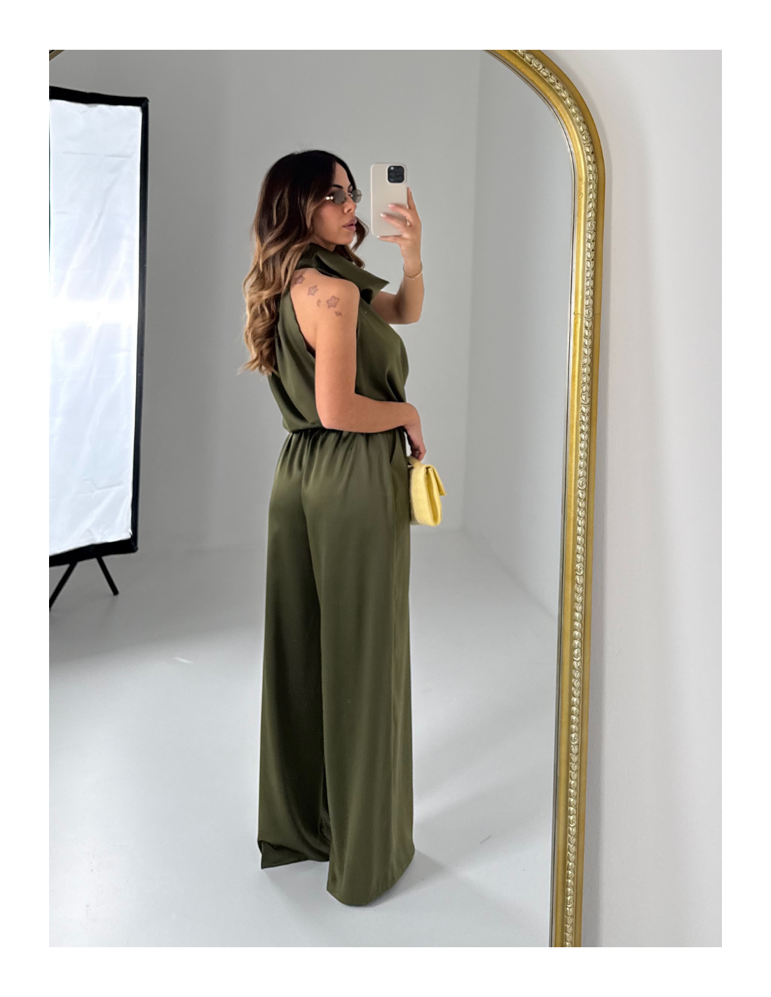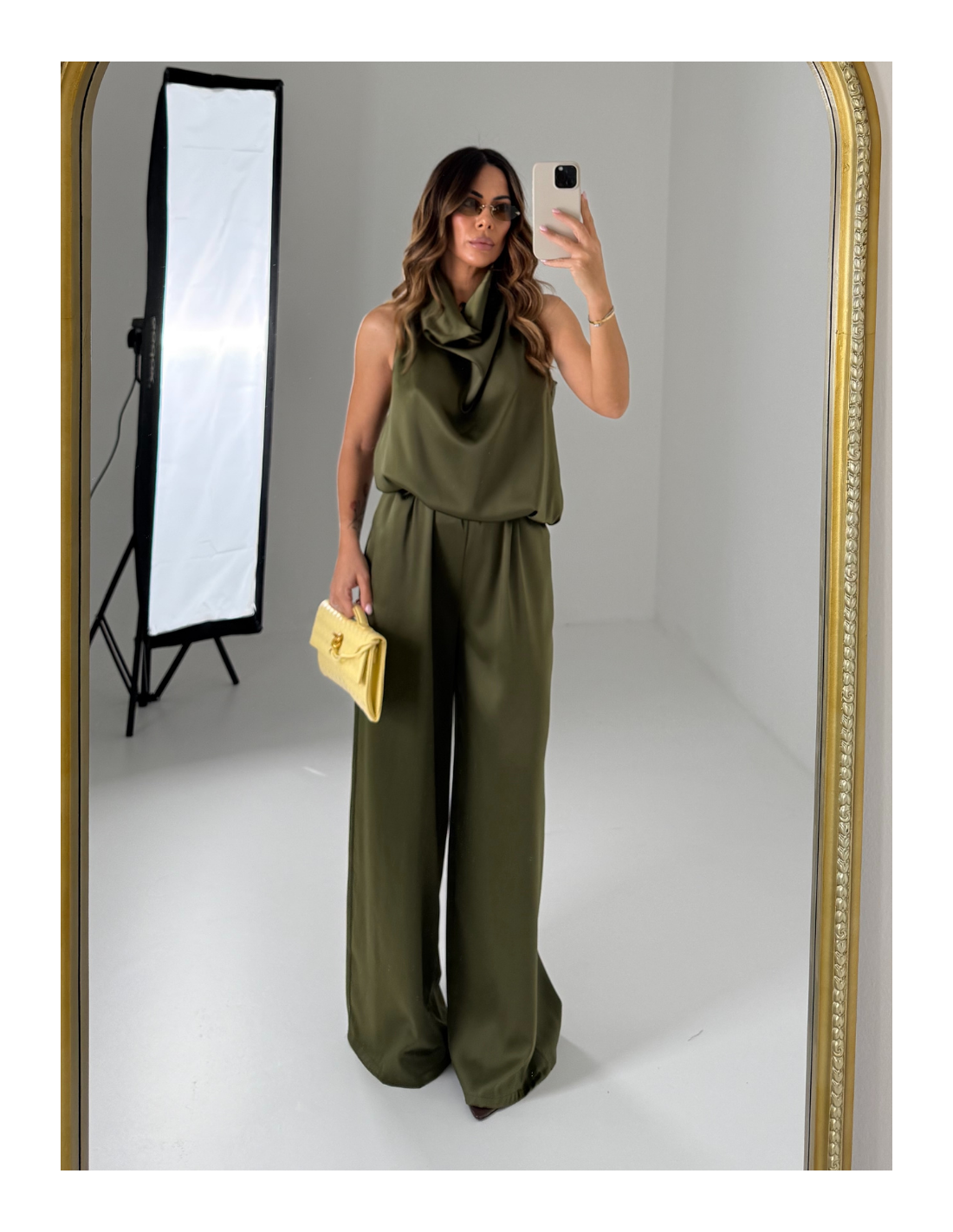 Il pantalone è coordinato nello stesso tessuto e colore, con una linea dritta e fluida, che scende morbida lungo la gamba allungando la figura.