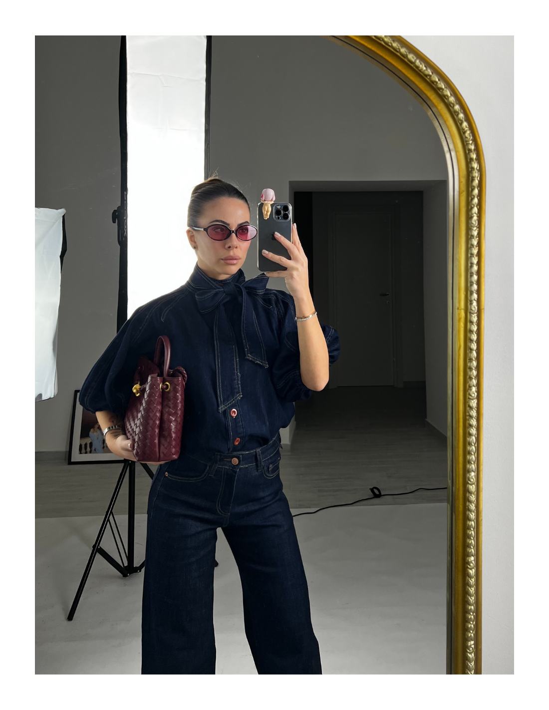 Camicia in denim con bottoni a contrasto bordeaux ,fiocco removibile.