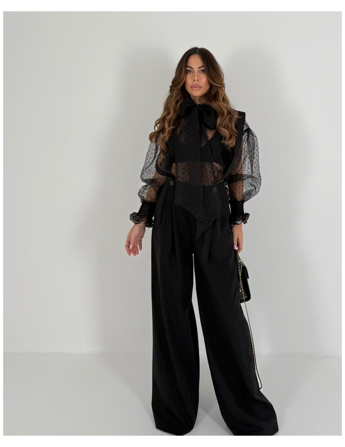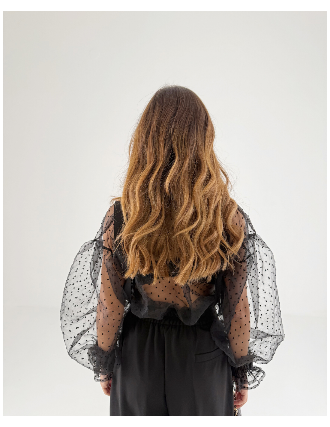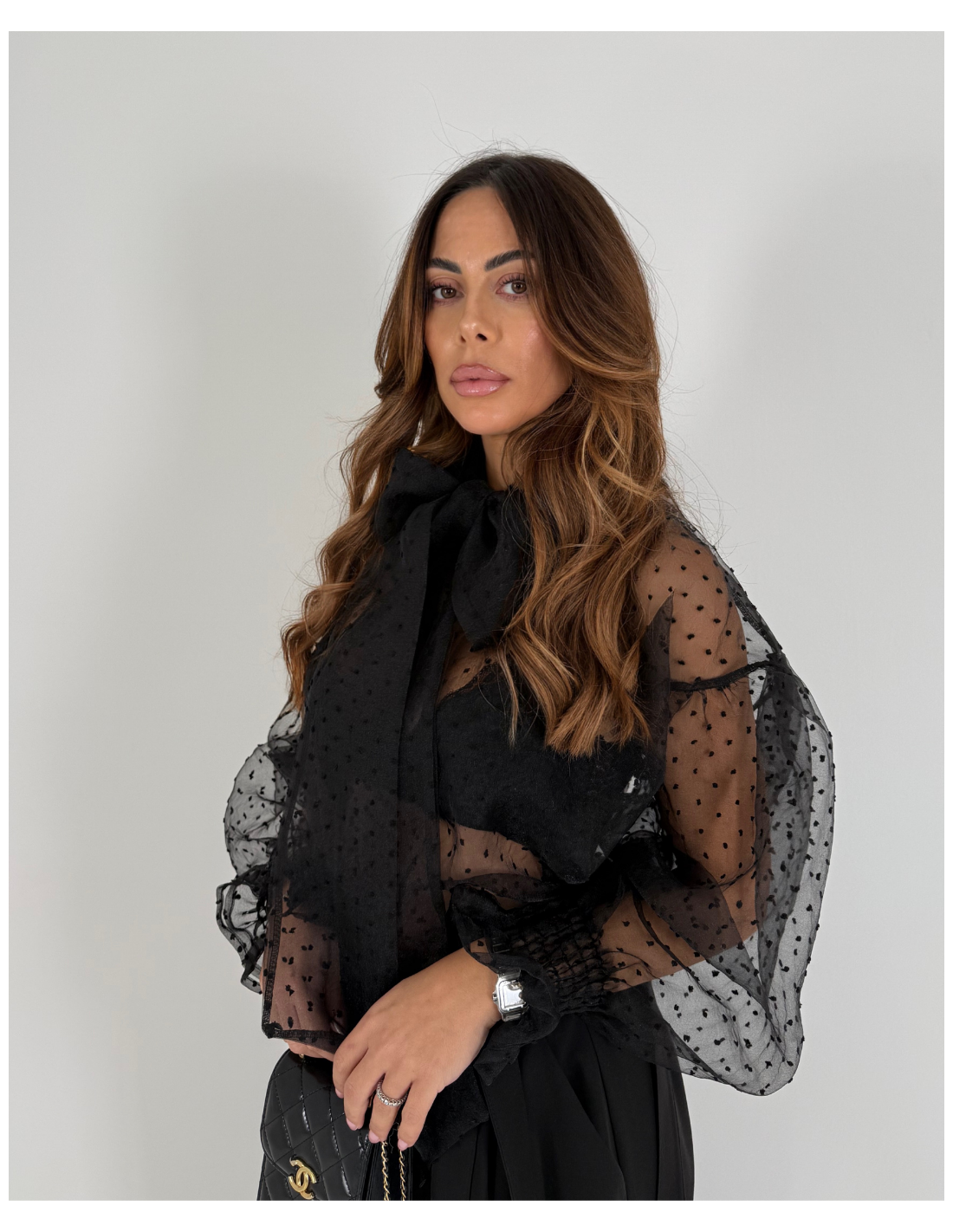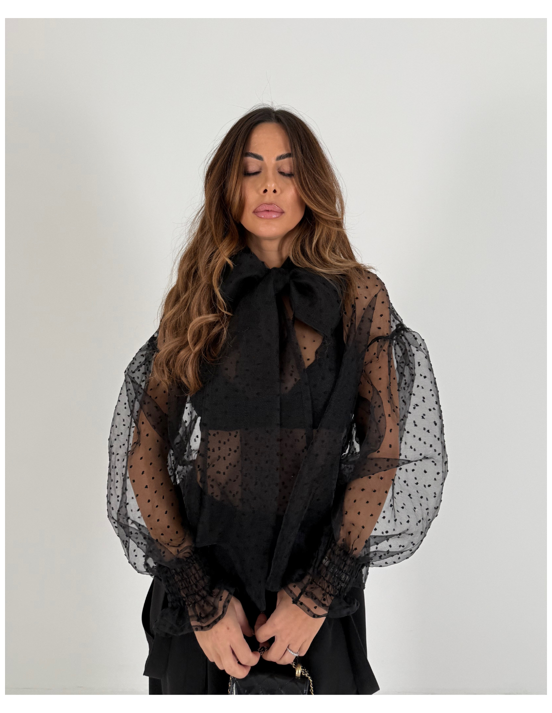 Camicia completamente velata , a pois , con maniche leggermente a palloncino che si stringono al polso con un elastico