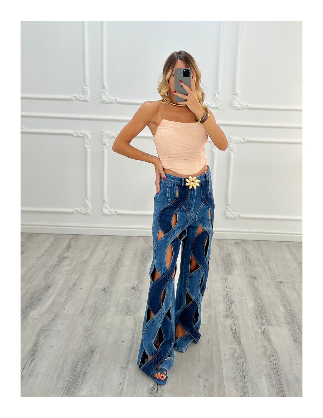 Jeans bicolore, intreccio aperture sul davanti, con dettaglio fiore.