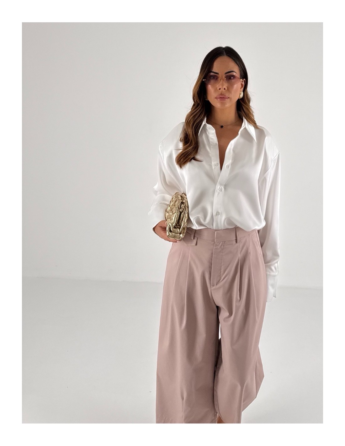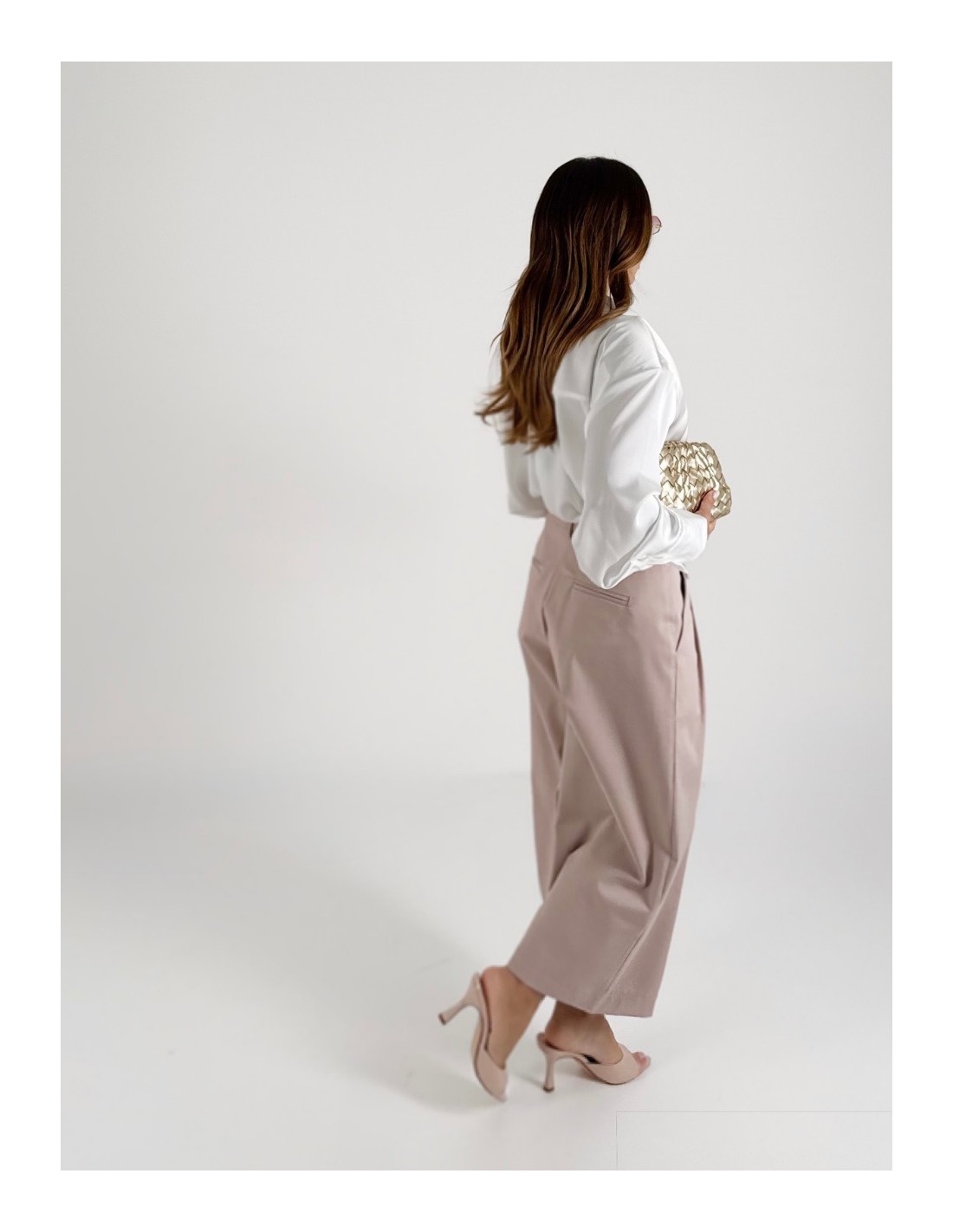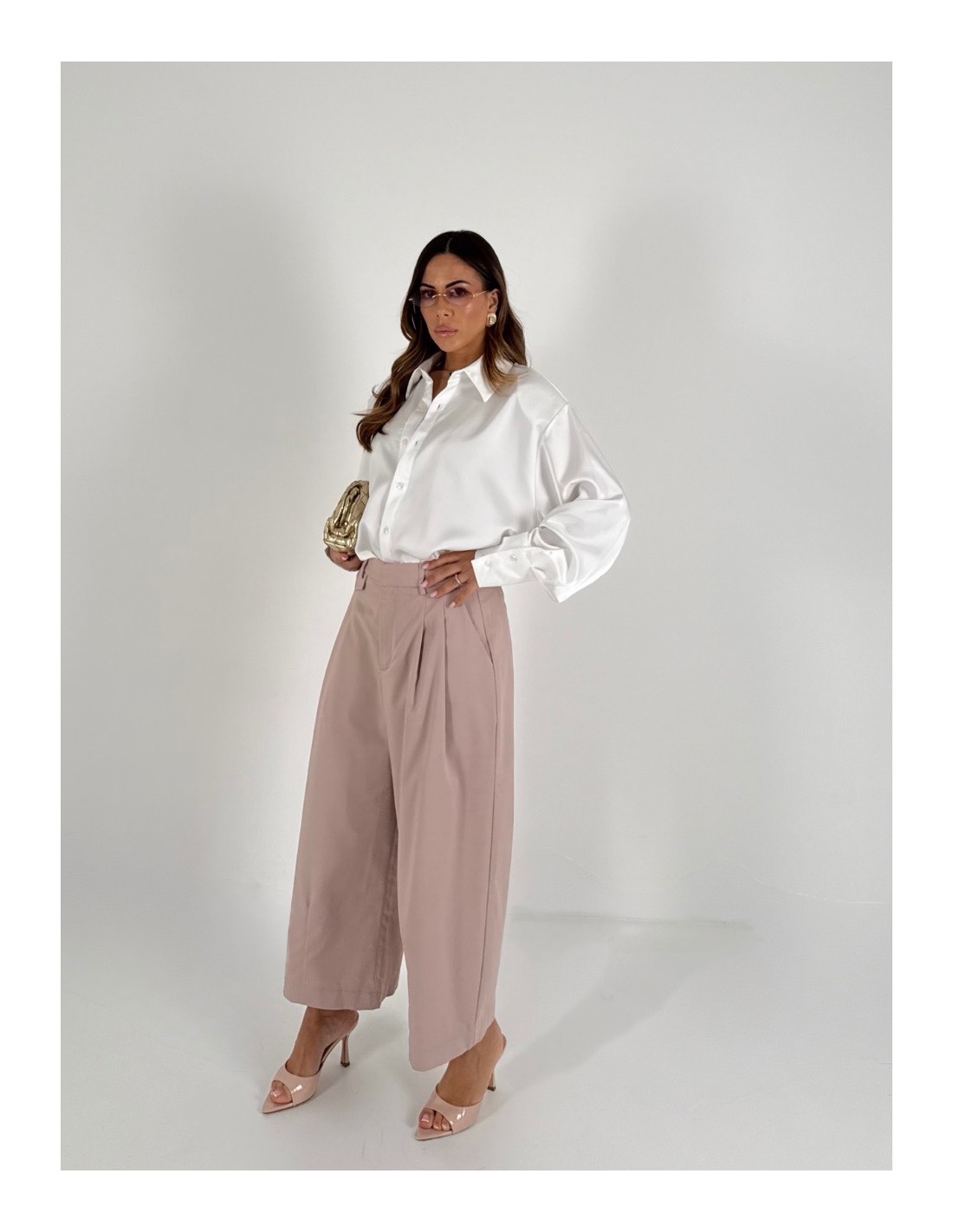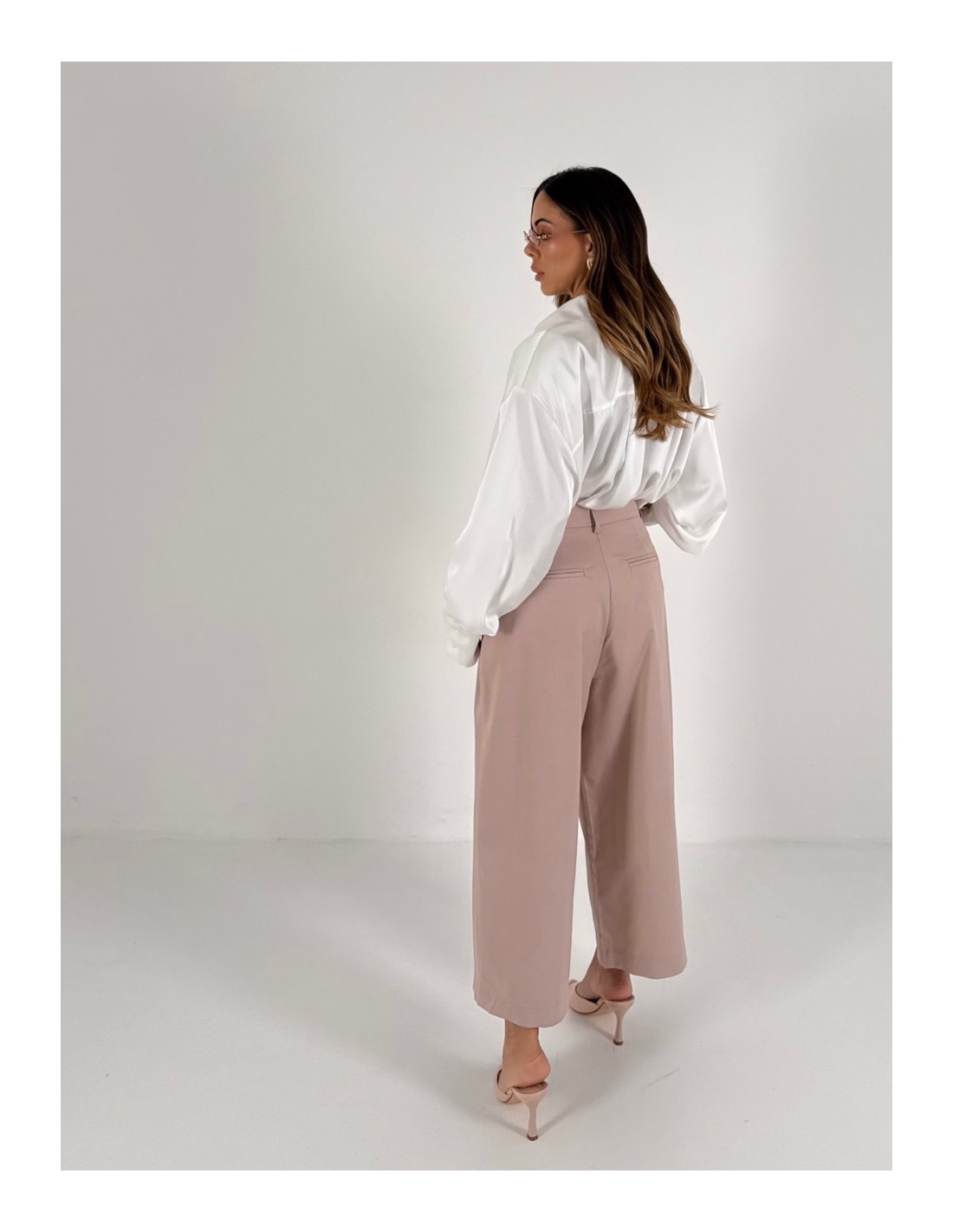 taglio ampio e morbido , con gamba larga che scende dritta fino a metà polpaccio