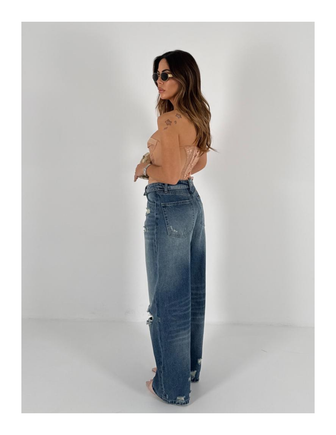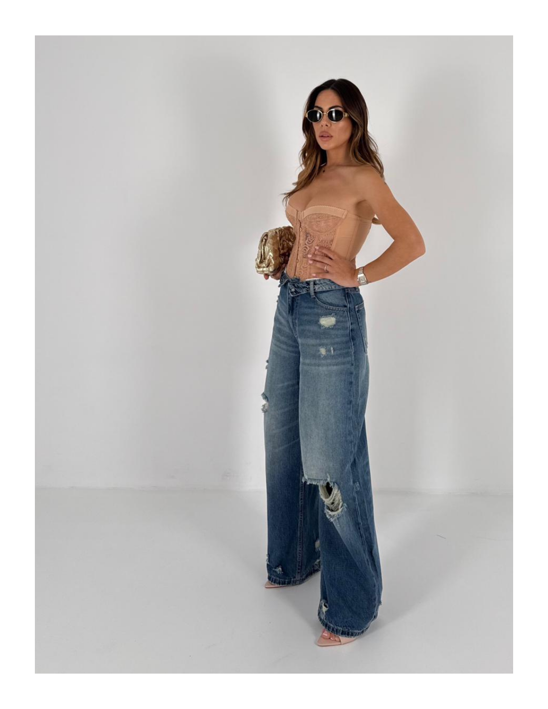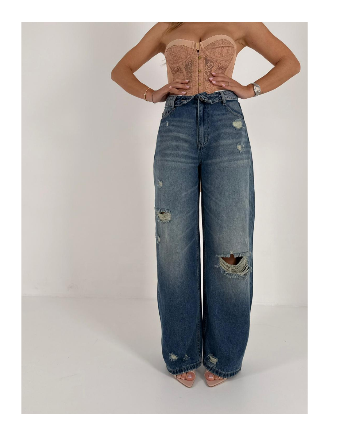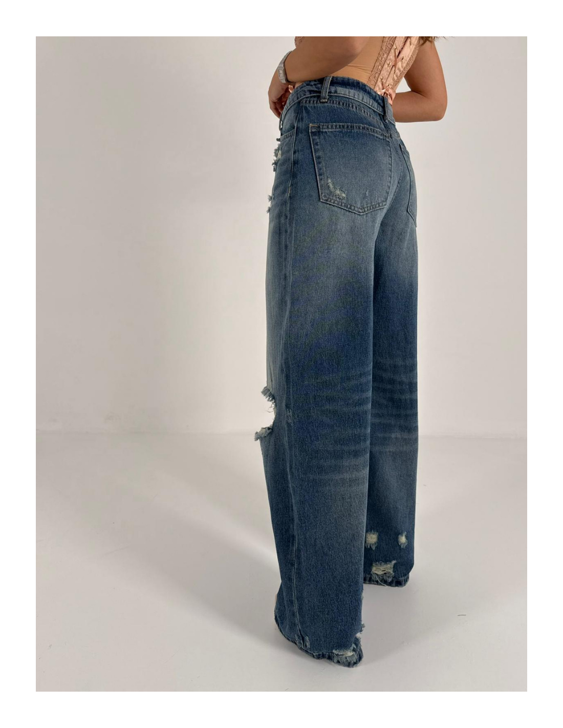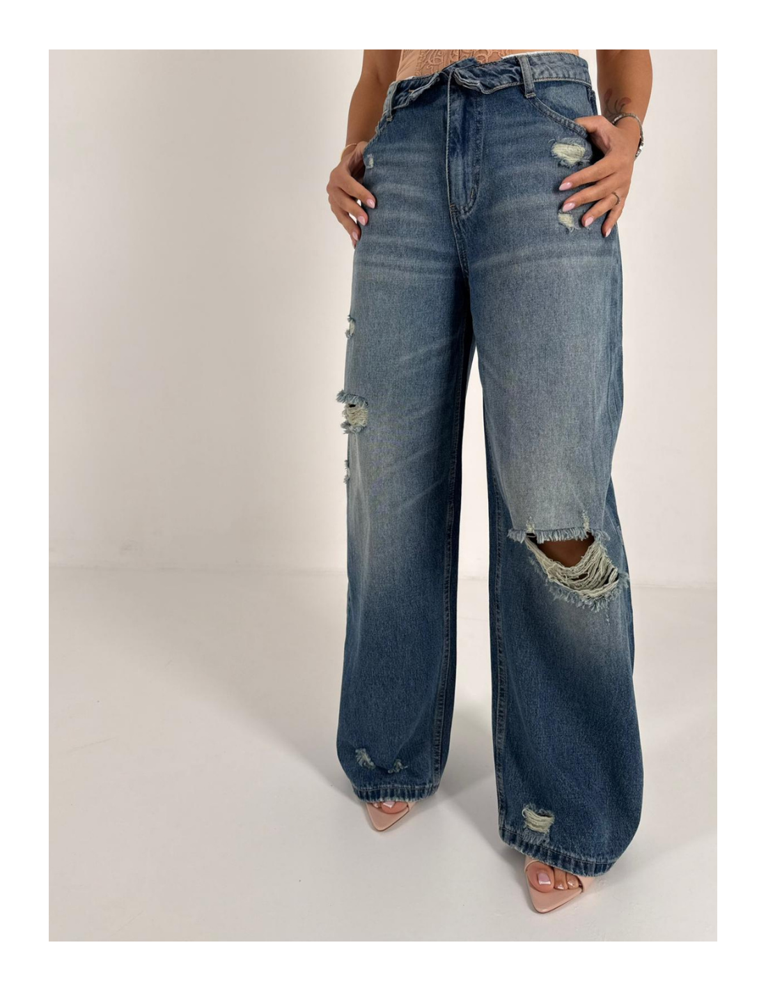 Presenta degli strappi distribuiti lungo tutta la gamba , alcuni più piccoli ed altri più evidenti con fili a vista che danno un