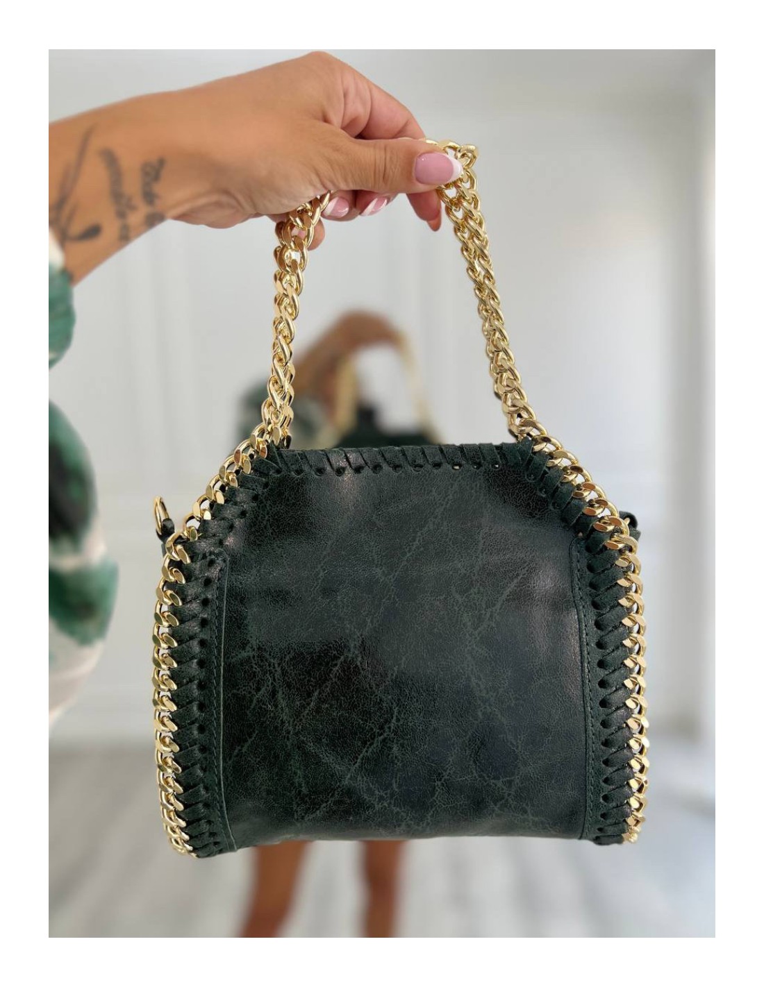 borsa in vera pelle con catena a mano e tracolla removibile.