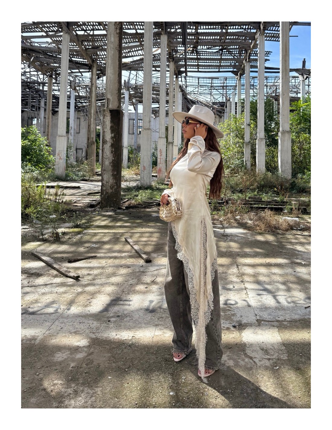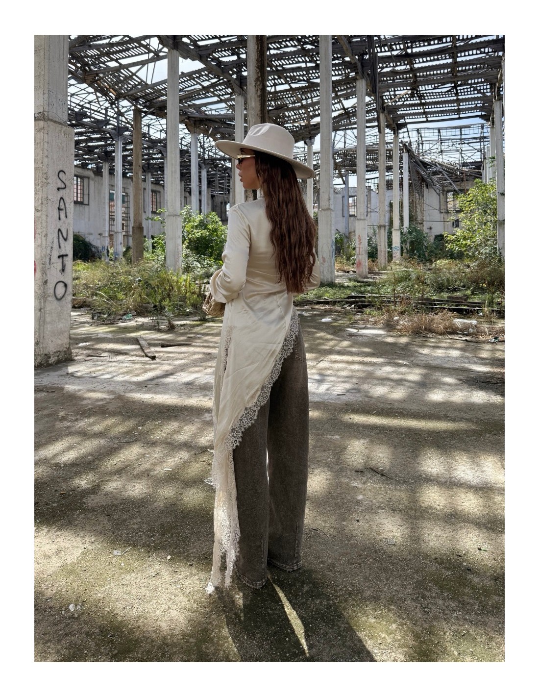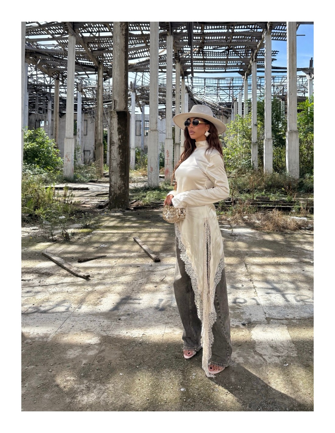 Maglia effetto raso con mezzo collo e inserti in pizzo.
