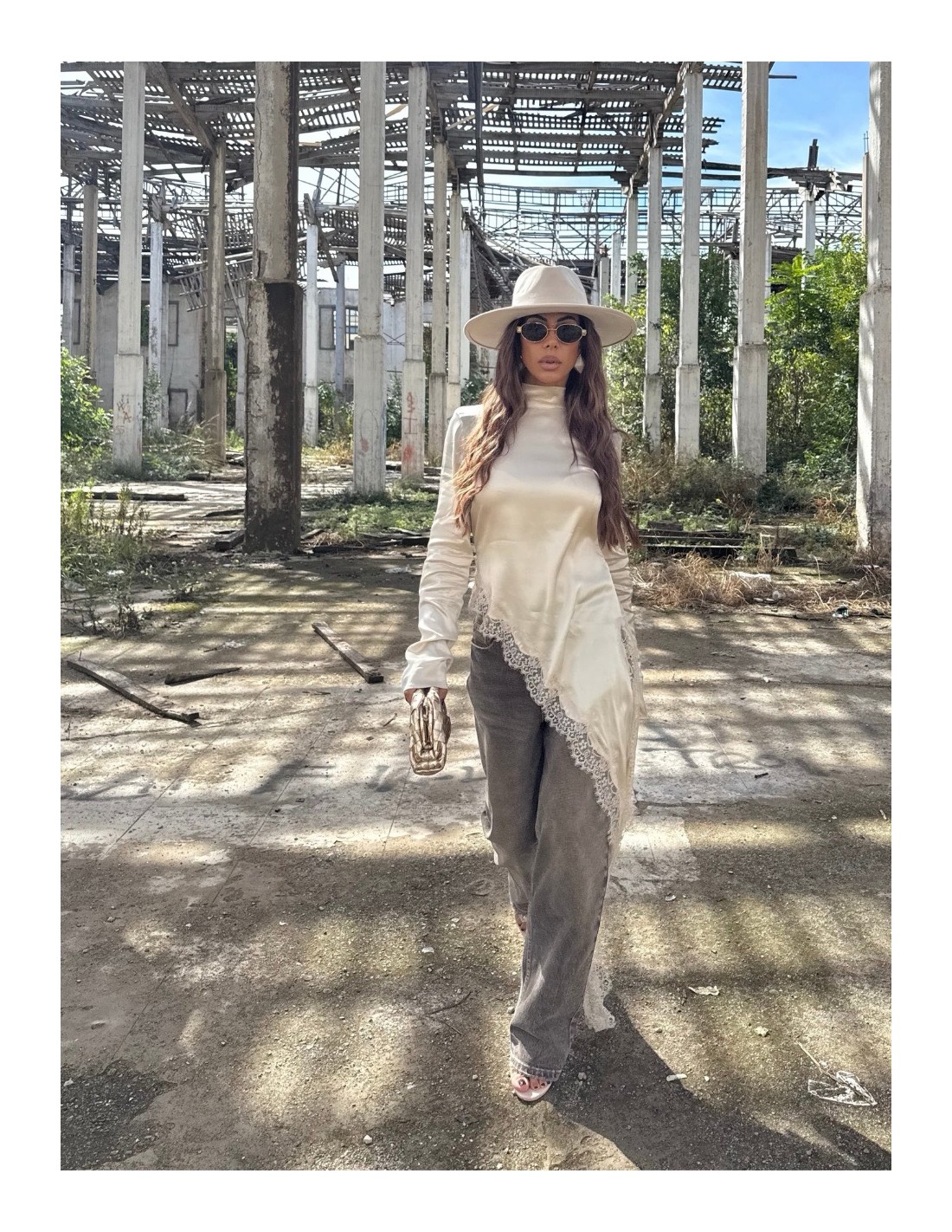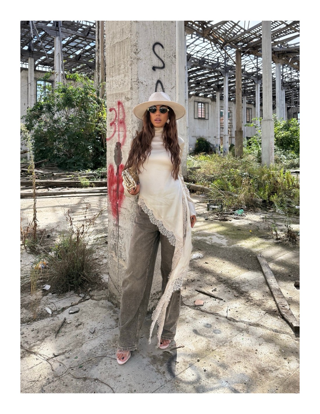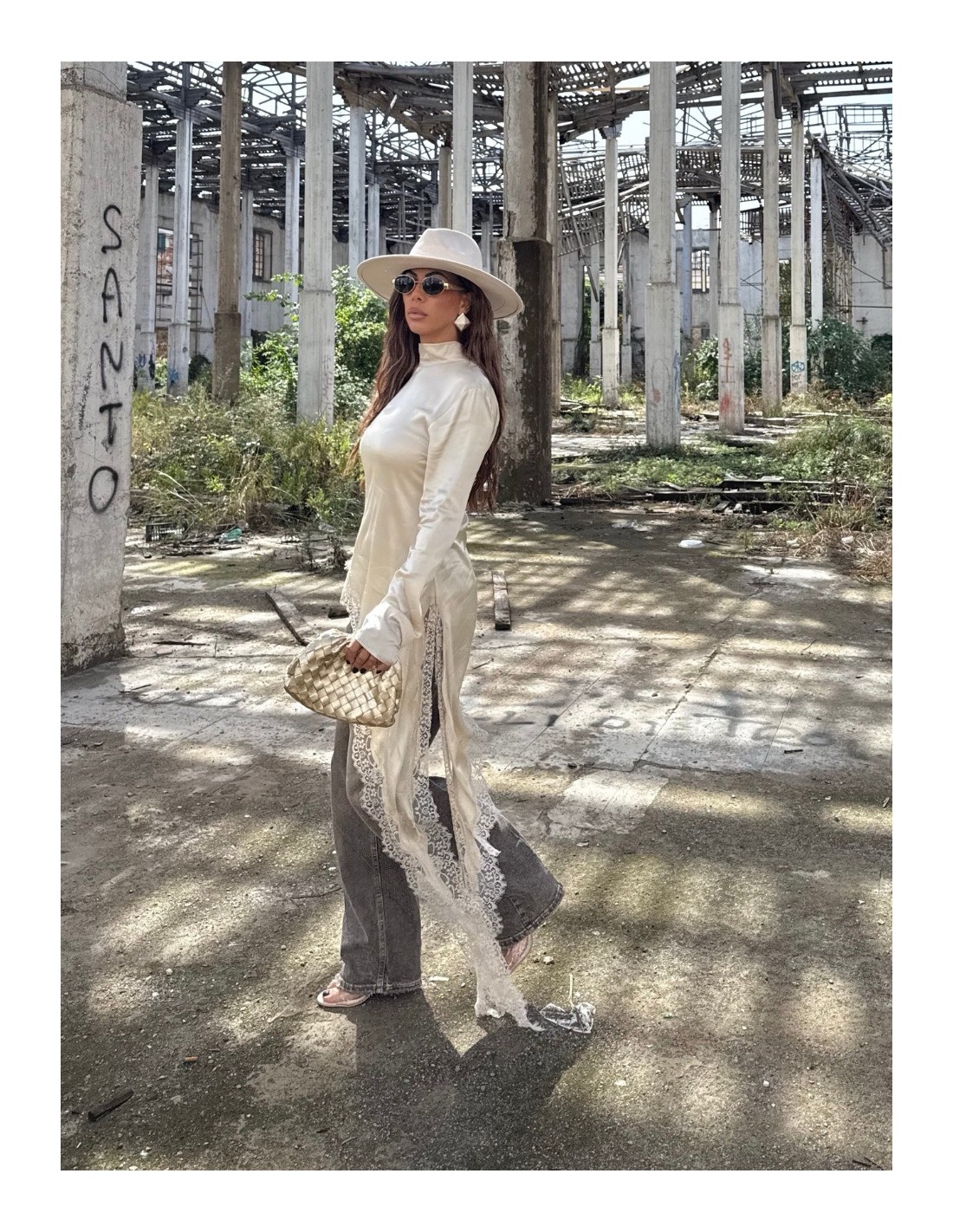 Maglia effetto raso con mezzo collo e inserti in pizzo.